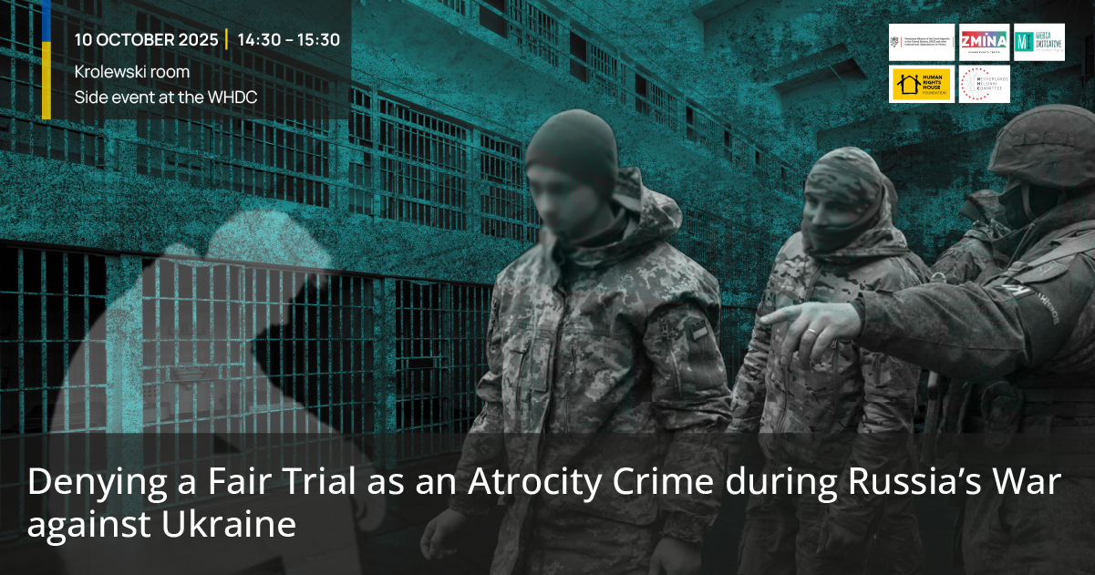 The side event “Denying a Fair Trial as an Atrocity Crime during Russia’s War against Ukraine” takes place on Friday, 10 October 2025, at 14:30-15:30 in the Krolewski room on the margins of the Warsaw Human Dimension Conference. It is organized by the Human Rights Centre ZMINA and Media Initiative for Human Rights with the support of the Czech Delegation to the OSCE, Human Rights House Foundation, and the Netherlands Helsinki Committee.
