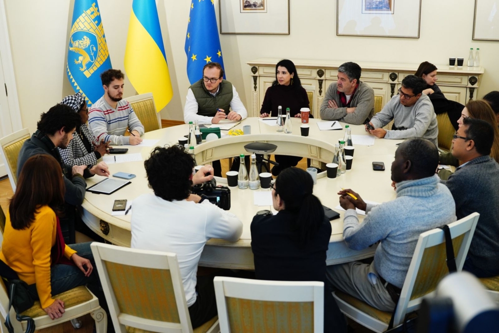 Фото: Зустріч у Львівській міській радіДо складу делегації увійшли дослідники, журналісти та науковці з Аргентини, Мексики, Бразилії, Коста-Рики, Демократичної Республіки Конго, Кенії, Киргизстану, Індії, Малайзії та М’янми — Ана Васкес Кольменарес, Анні Моді, Ігнасіо Монтес де Ока, Лейла Сеїтбек, Лув Пурі, Муніра Мустаффа, П’єтро Серконе, Прамод Джайсвал, Су Мон Тант, Урія Фанчеллі та Веллінгтон Нйонгеса.